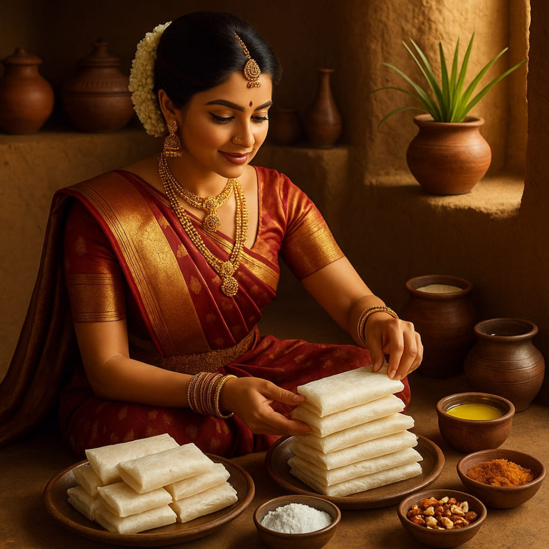 Pootharekul is a traditional Andhra sweet made with ultra-thin rice starch layers filled with jaggery or sugar and ghee. Its unique crispy texture and melt-in-the-mouth sweetness make it truly one-of-a-kind.