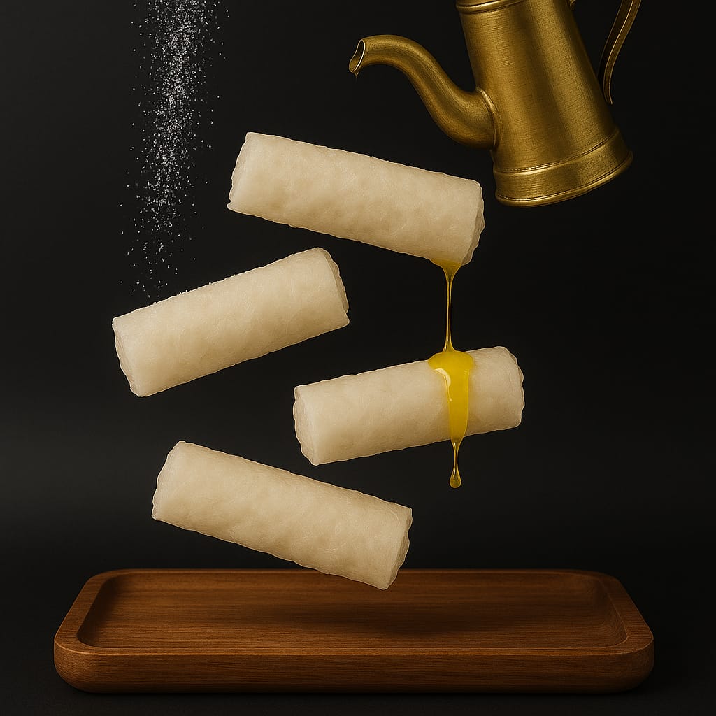 Delicate, paper-thin rice starch sheets filled with sweetened powdered sugar and a touch of ghee—an authentic Andhra delicacy made the traditional way.